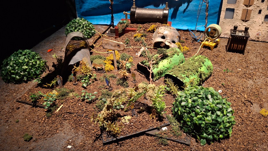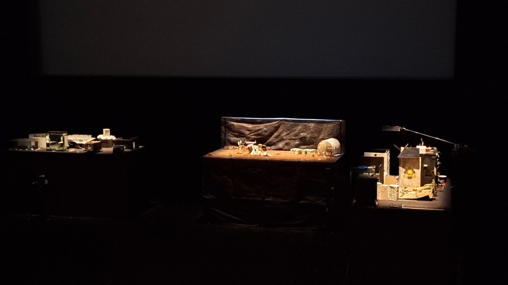 The show promised itself to “combine the languages of theatre, audiovisual art, and live music”, and it did just that. It’s difficult to describe the complexity of the operation. Using a combination of models, cut-out figures on bases like flattened Subbuteo players, toys, their smartphones, and print, the audience is drawn into the post-apocalyptic world with the show’s creators, who play themselves onstage and control miniature versions of themselves.
